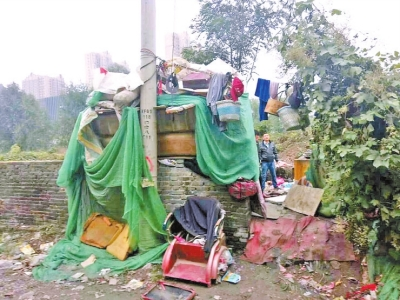 他們從花園路劉莊到鄭上路,走了近2個(gè)小時(shí)。走到鄭上路須水河西岸時(shí),發(fā)現(xiàn)在一塊荒蕪的墳地中,有一窩棚,隱約看到有身影在走動(dòng)。近前看到,一位瘦黑的老人站在雨里,正在一簡(jiǎn)陋土灶上煮面條。老人身上的衣服已淋濕,陪老人的是一條流浪狗,狗是老人撿的。窩棚很小,僅能容下一人,蜷縮著才能躺下。由于窩棚漏雨,鋪蓋內(nèi)也是濕的。
