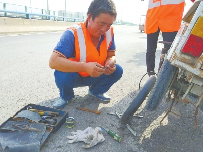 6日臨近中午,在中原路南水北調(diào)大橋附近,一位身穿環(huán)衛(wèi)工服裝的男子,正在路邊修補一輛電動三輪輪胎。只見他,技術嫻熟,從扒胎到補好胎安裝到位充氣,用時不到20分鐘。三輪車輪胎修補好,對方騎車離去,他則收好修車工具,又開始清掃馬路上的垃圾。