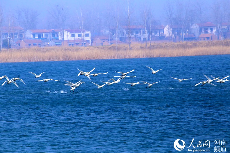 人民網(wǎng)鄭州3月14日電 (黃莎)春到黃河故道,和風(fēng)送暖,綠柳吐翠。近日,河南省民權(quán)黃河故道國(guó)家濕地公園迎來(lái)一批“稀客”—— 一碧萬(wàn)頃的龍澤湖湖面游蕩著數(shù)百只白天鵝。春水浩渺,天鵝起舞,給早春的黃河故道濕地公園增添了一道亮麗的風(fēng)景線(xiàn),吸引大批游人駐足靜賞。